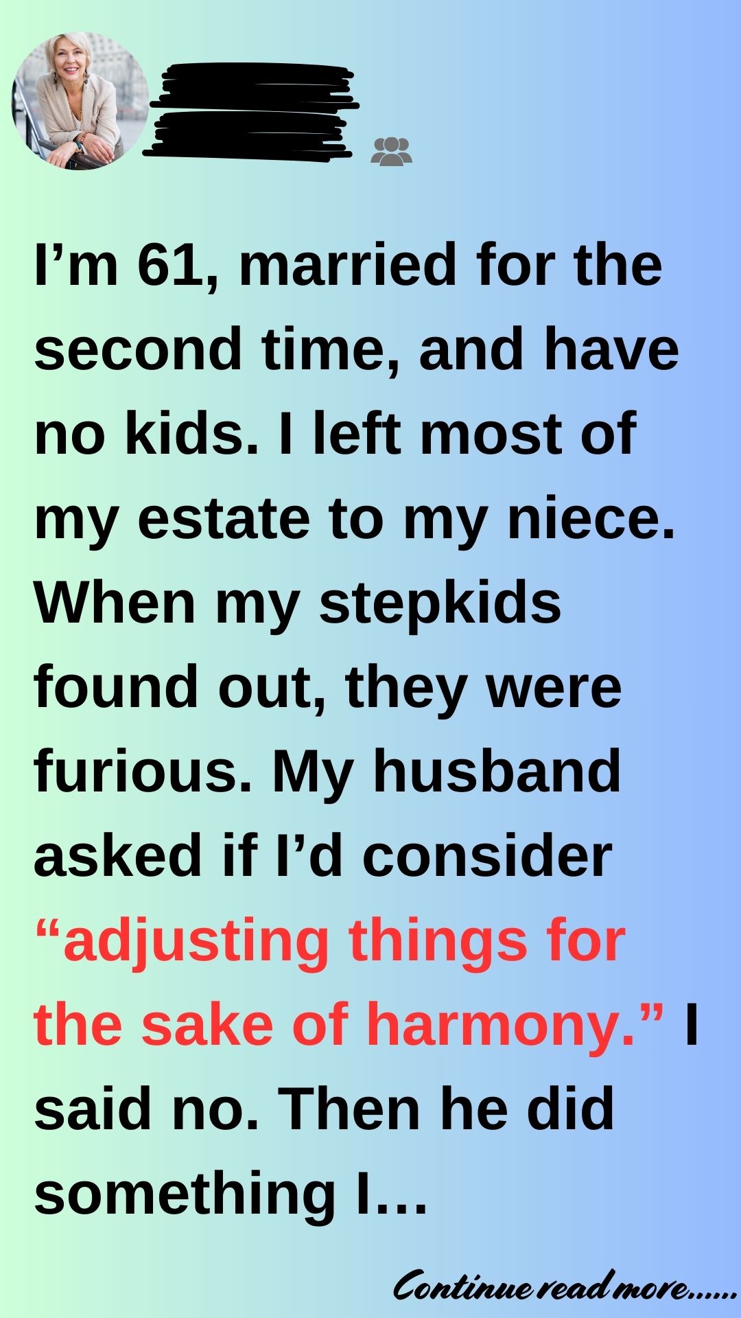 My husband, trying to “keep the peace,” asked if I would reconsider. When I said no, he took it personally and changed his own will so that everything he owns goes exclusively to his children. It stung, but I didn’t back down.
