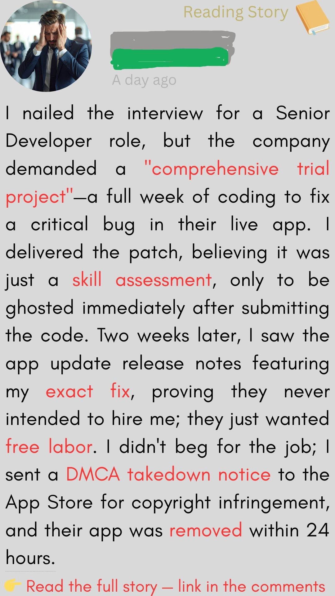 They thought they got a free bug fix from a desperate job seeker. They forgot that without an employment contract, I still owned the copyright.