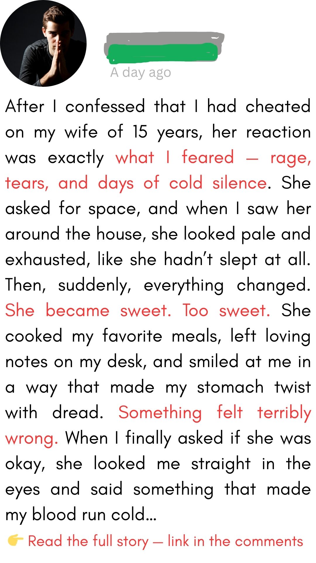 I cheated on my wife — and eventually, the guilt became impossible to live with. When I finally confessed, her reaction was exactly what I deserved. She was furious. She cried, yelled, and then asked for space. For days, she barely spoke to me. When I did see her, she looked pale, drained, like she hadn’t slept or eaten properly.