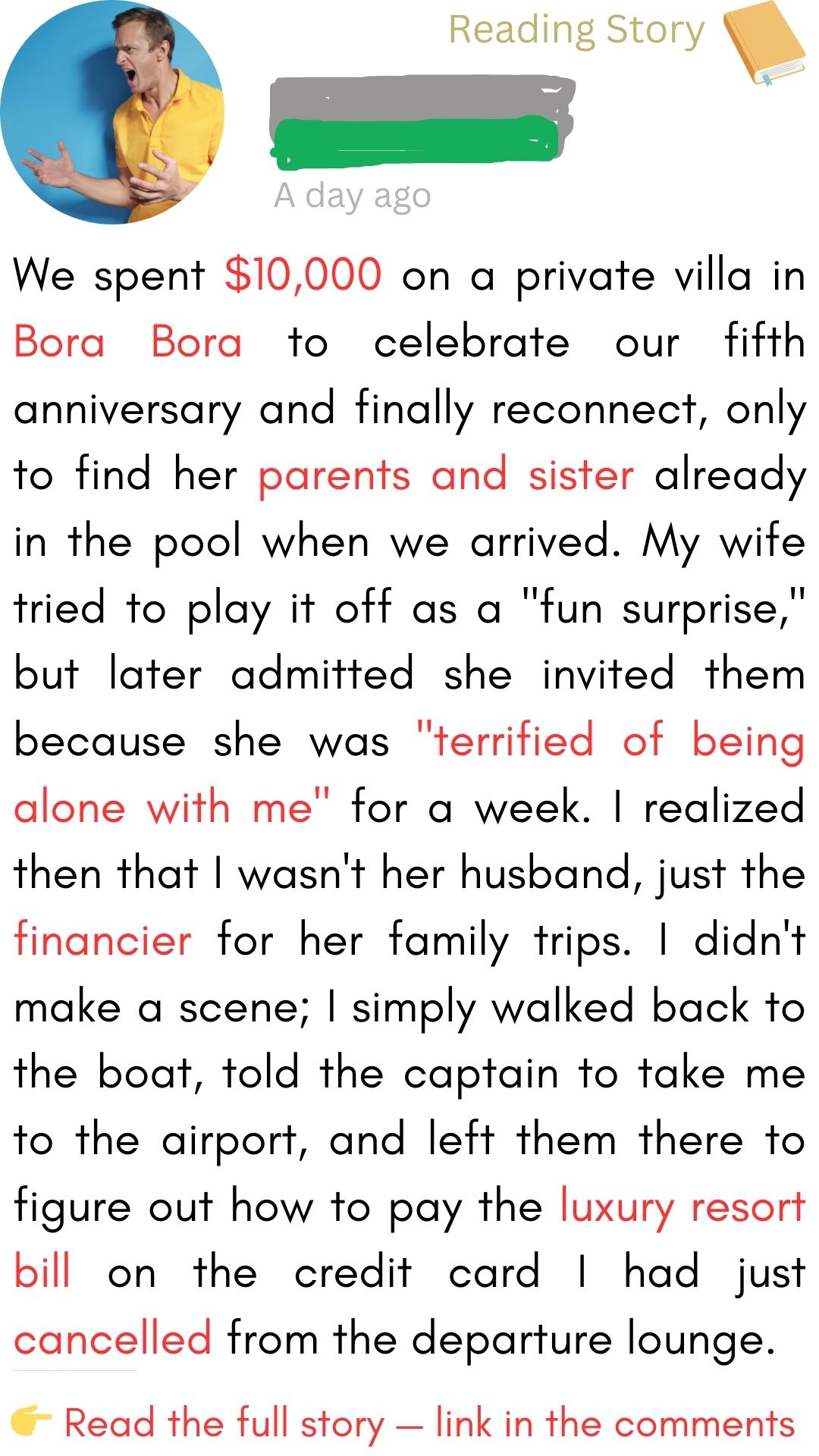 My wife, Sarah, and I had been drifting apart. We were “roommates who paid bills together.” To fix it, I pulled out all the stops for our fifth anniversary. I booked an overwater bungalow in Bora Bora. The cost was eye-watering—$12,000 for the week, plus flights. But I figured our marriage was worth the investment. We needed reconnection. We needed silence.